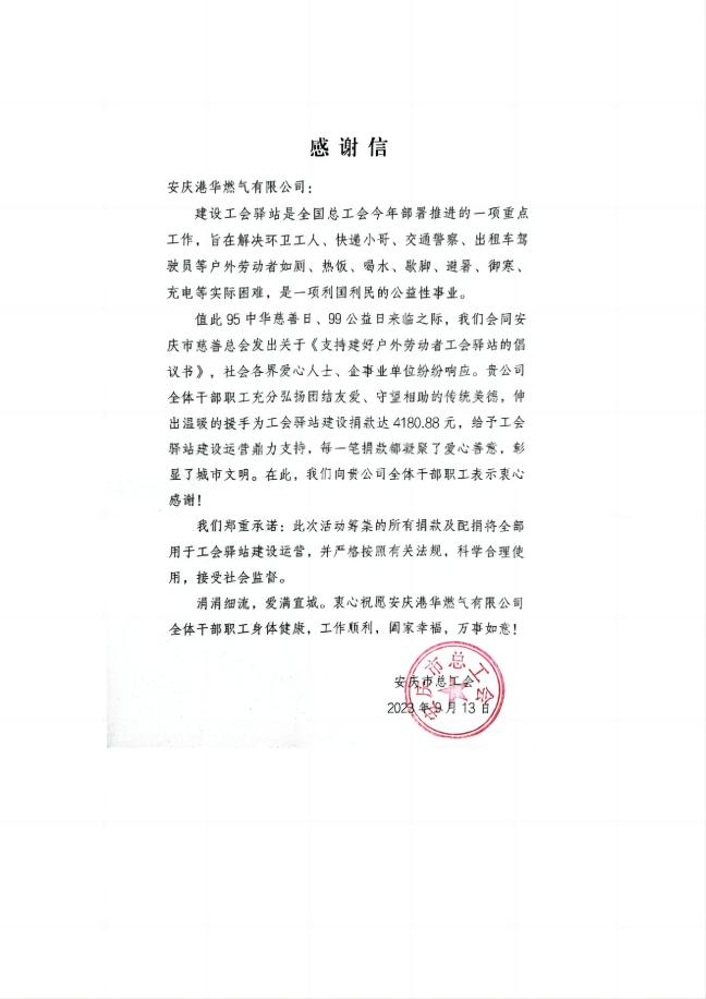 為進(jìn)一步傳播慈善文化,弘揚(yáng)傳統(tǒng)美德,推動(dòng)戶外勞動(dòng)者工會(huì)驛站建設(shè)。在全國(guó)第八個(gè)“中華慈善日”來臨之際,安慶港華高度重視,認(rèn)真部署,依法組織,在公司開展“慈善日捐款”活動(dòng)。